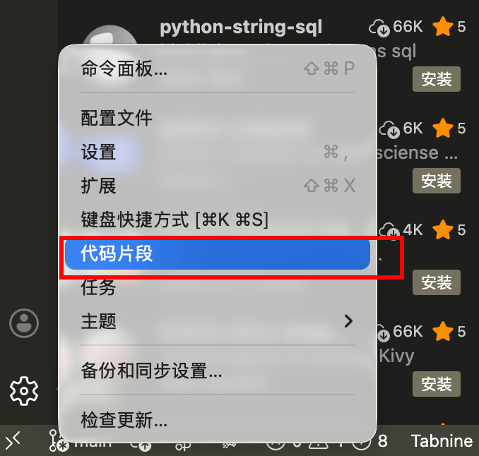 打开左下角设置中代码片段
