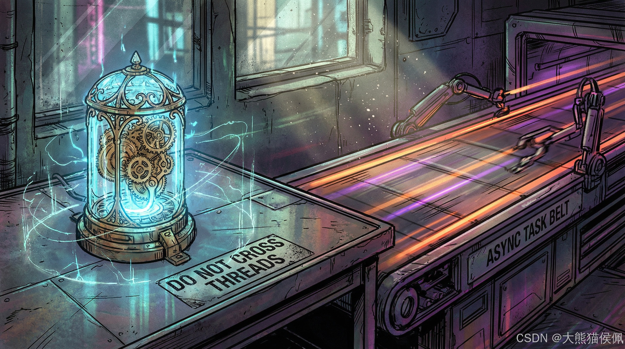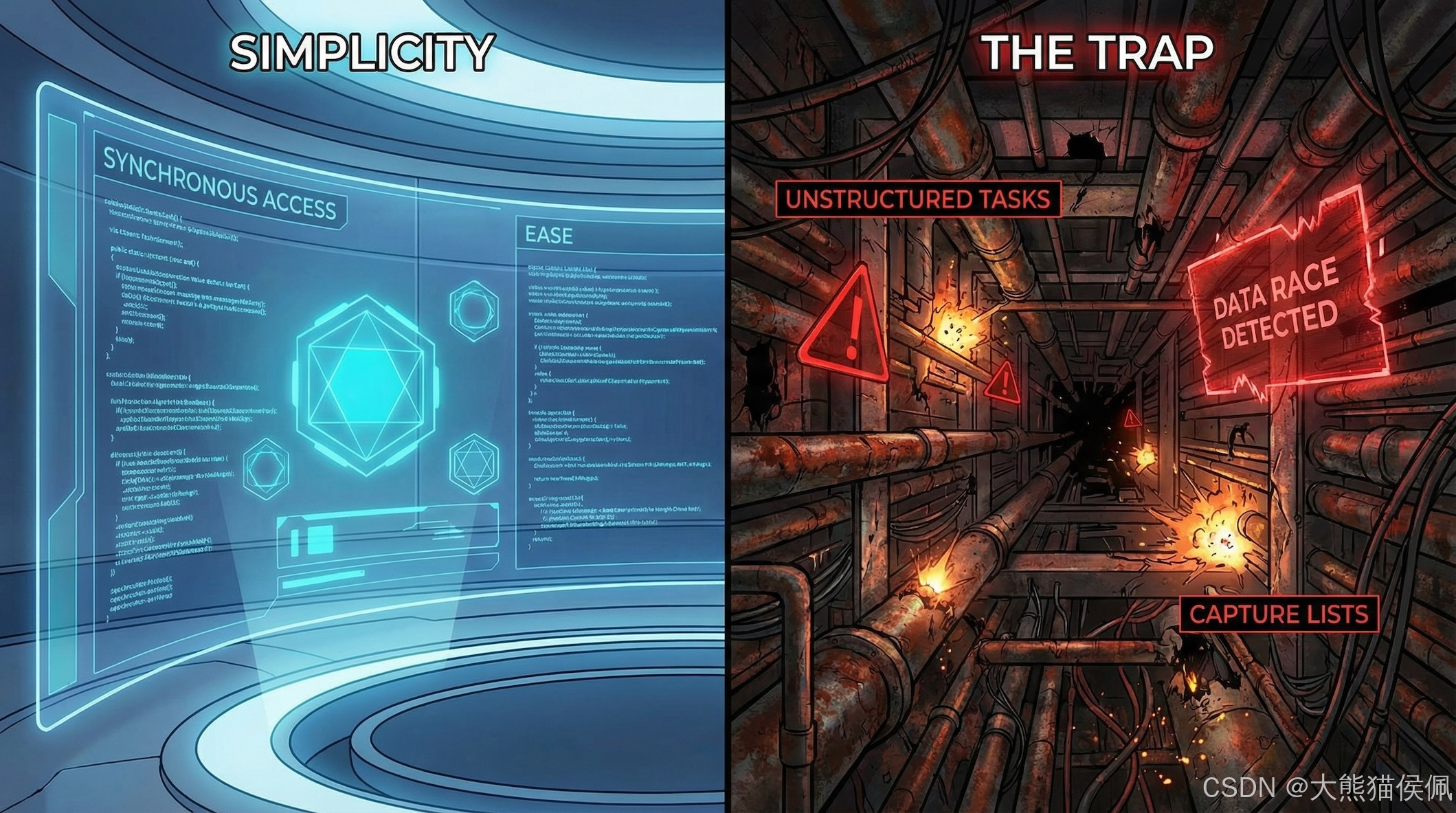 "这就像你在没有任何保护措施的情况下,试图把一个易碎的花瓶扔到正在高速运转的传送带上。在一个 nonisolated 的函数里启动 Task,意味着上下文是不确定的。没有线程安全的保证,编译器绝不会放行。"