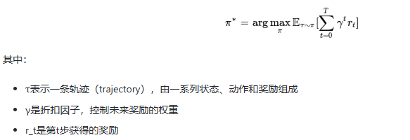强化学习的目标 是学习一个最优策略π*,使得智能体在与环境交互过程中获得的累积奖励最大化: