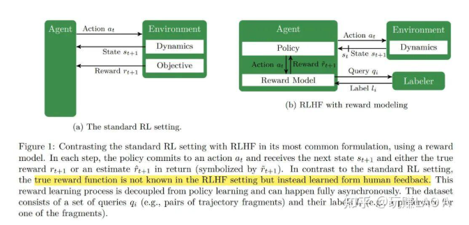 RLHF可以看作是传统强化学习的一个扩展,其核心区别在于奖励信号的来源。在RLHF中,我们首先训练一个奖励模型(Reward Model, RM)来预测人类的偏好,然后使用这个奖励模型来指导策略的优化。