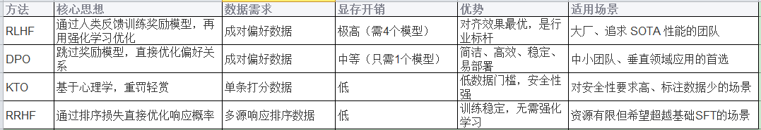 - 对于中小团队或资源有限的场景,DPO 被认为是当前性价比最高的对齐方法。