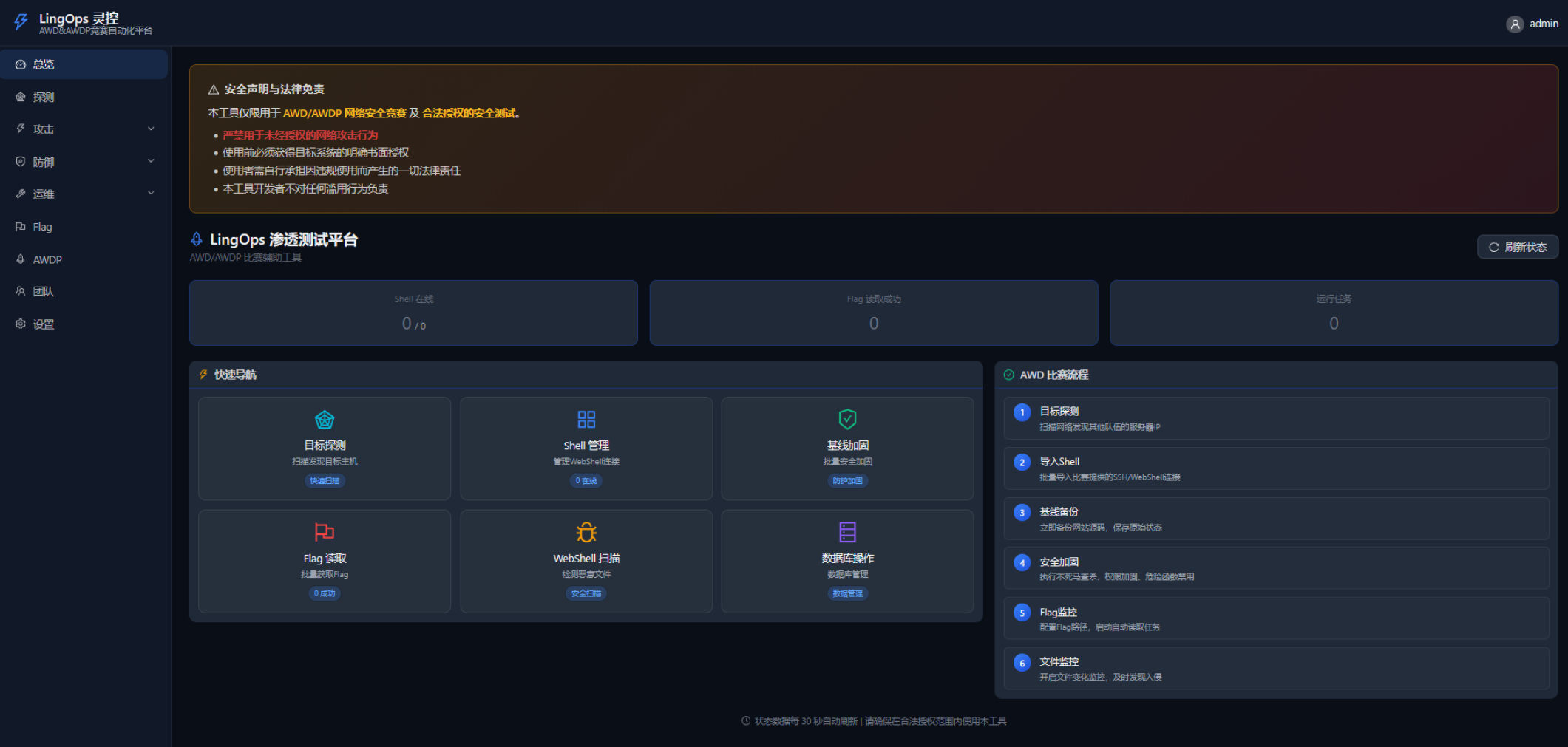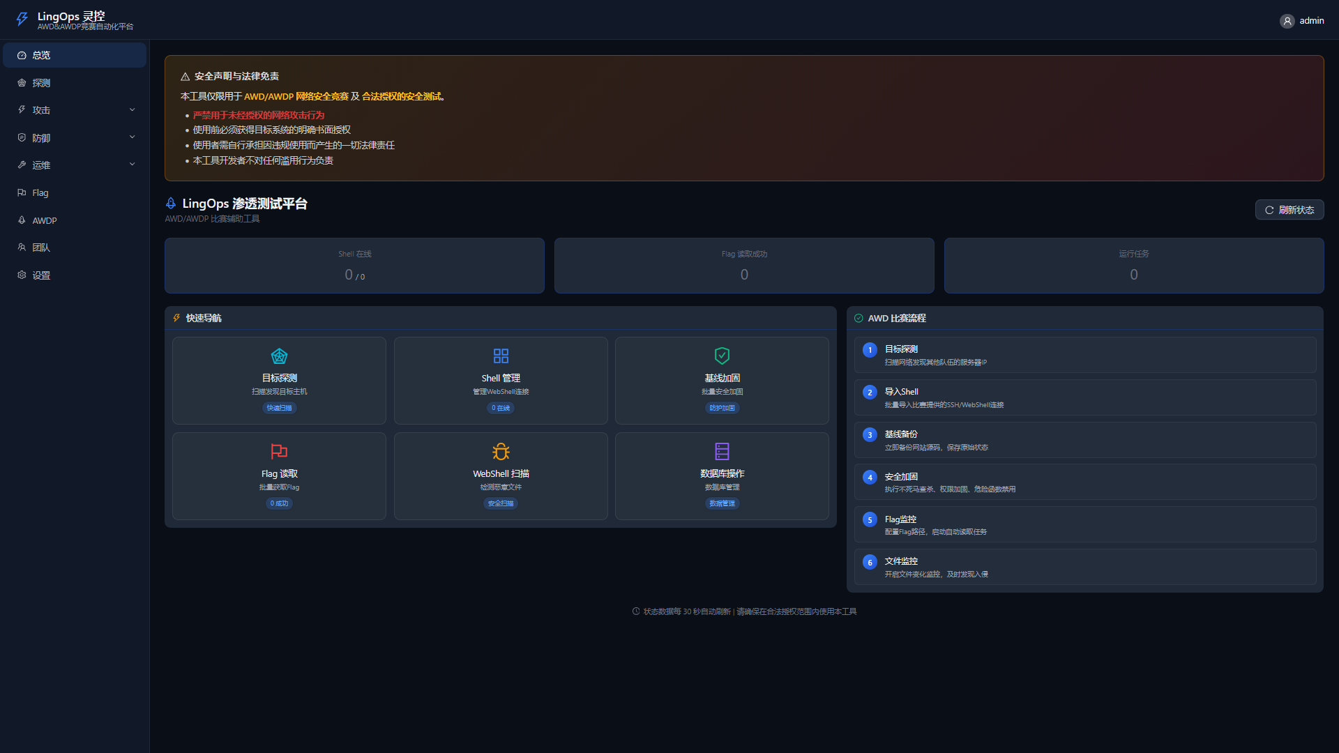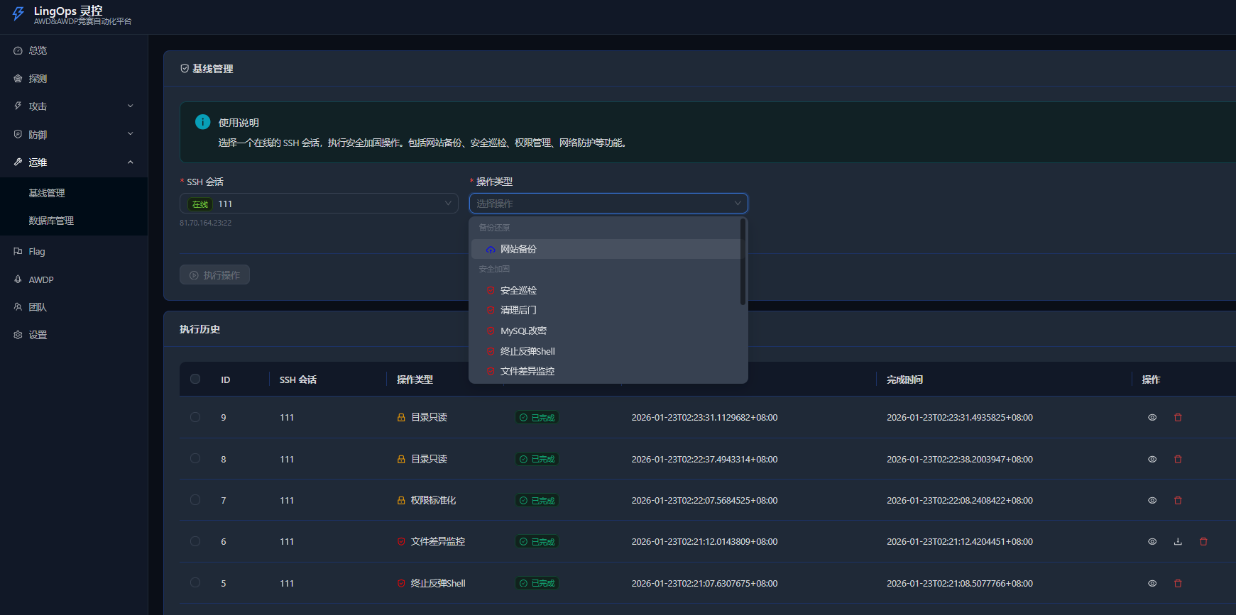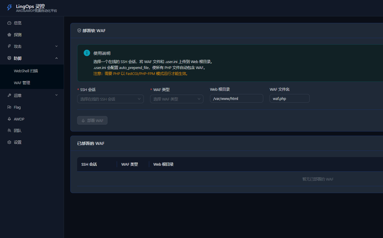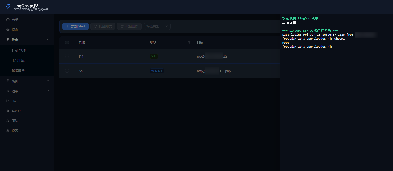 LingOps(灵控) 是一个专为 AWD/AWDP 攻防竞赛设计的竞赛自动化平台,提供 IP探测、WebShell 管理、SSH 终端、基线加固、Flag 读取等核心功能,帮助参赛选手在比赛中高效管理多个目标。