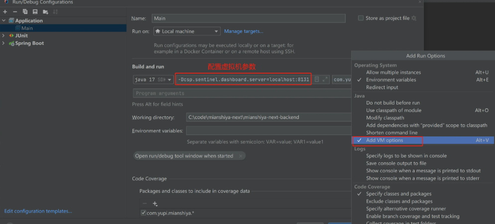 然后我们刚才是不是给SentinelTest添加了JVM参数配置,同样的我们现在要运用到整个项目,我们去给启动类MainApplication添加上刚才的那个参数配置。