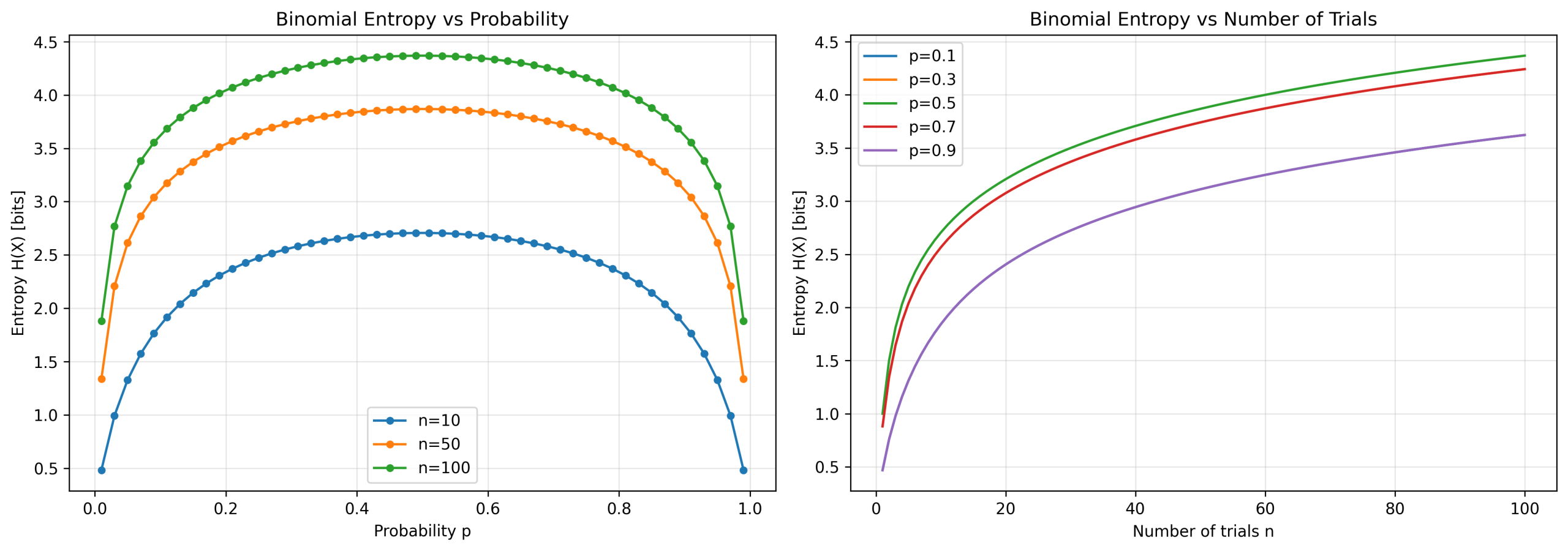 说明:分析二项分布的信息熵随参数 n 和 p 的变化规律,揭示不确定性与参数的关系。