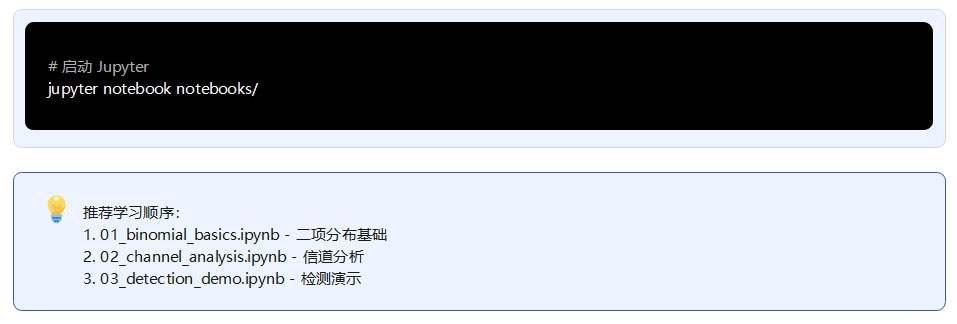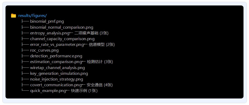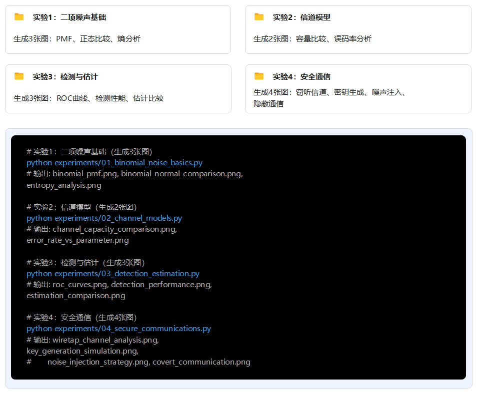 本项目通过4个系统性实验生成13张高分辨率图表(300 DPI),全面验证了二项噪声分析理论与算法的正确性。实验1(二项噪声基础)通过3张图表验证了二项分布的概率特性、正态近似条件及信息熵规律;实验2(信道模型)通过2张图表对比了BSC、BEC、Z信道的容量特性,仿真误码率与理论值误差小于1%;实验3(检测与估计)通过3张图表展示了Neyman-Pearson检测器的ROC曲线(AUC>0.9)以及MLE/MAP/MMSE估计器的性能对比,验证了MLE达到Cramér-Rao下界;实验4(安全通信应用)通过4张图表分析了窃听信道的保密容量、物理层密钥生成(一致率>95%)、噪声注入策略(保密容量提升30-50%)及隐蔽通信性能。所有实验结果与理论预测高度一致,图表质量满足学术发表要求,为二项噪声在安全通信中的应用提供了完整的实验支撑。