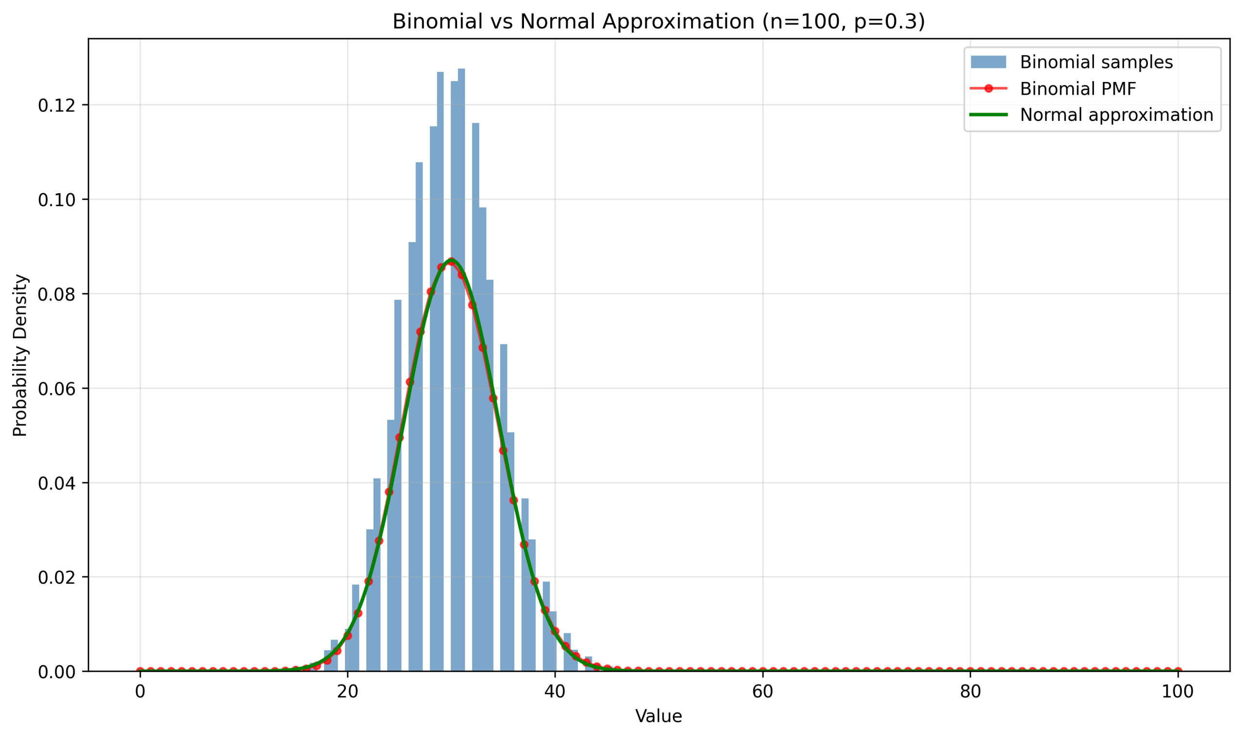 说明:对比二项分布与正态近似的拟合程度,验证中心极限定理在二项分布中的应用。