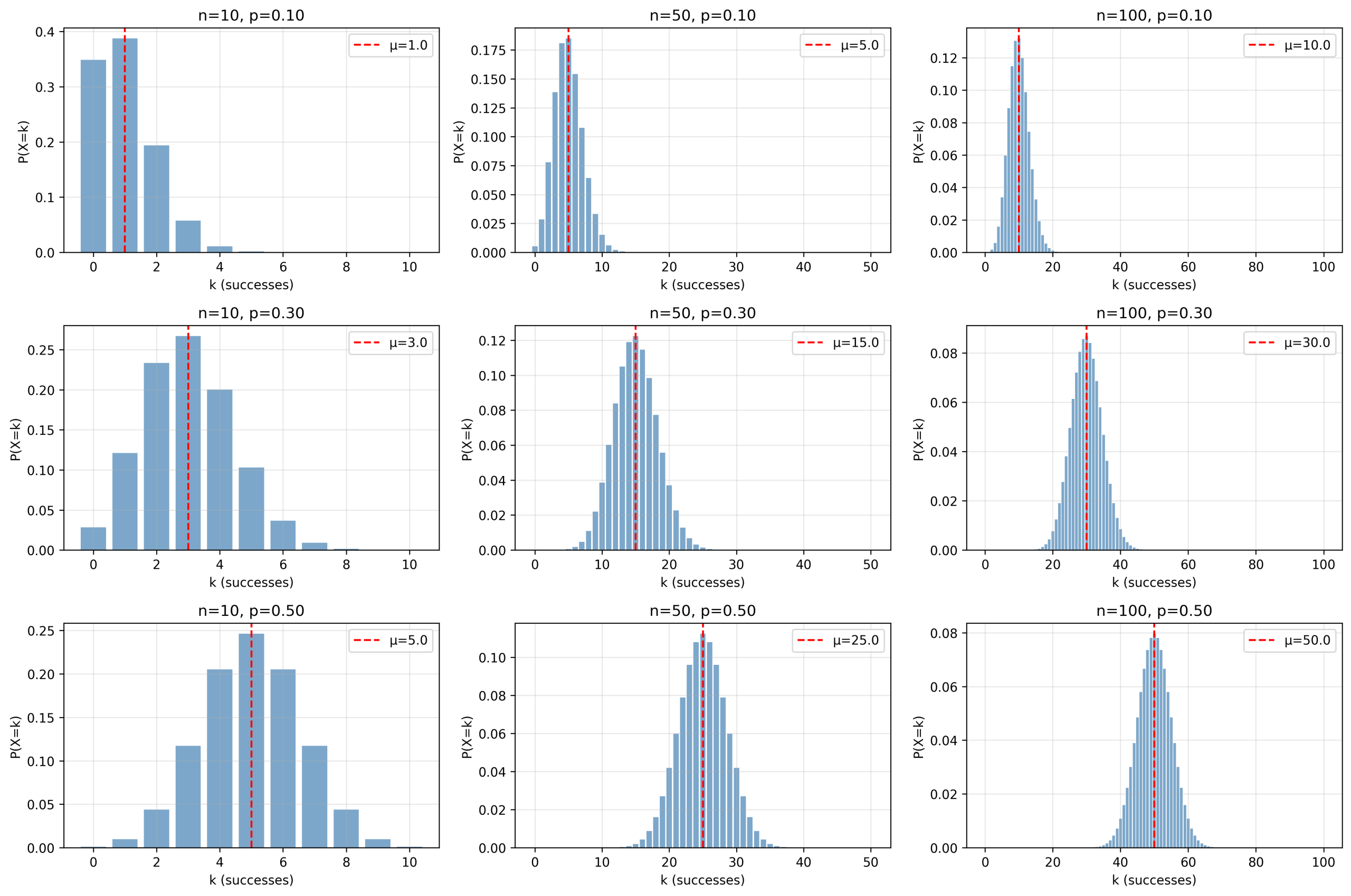 说明:展示不同参数 (n, p) 组合下的二项分布概率质量函数,验证分布形态随参数变化的规律。