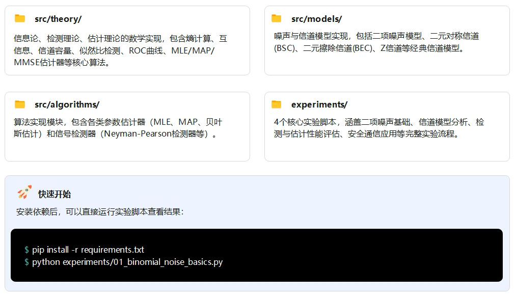 系统采用分层架构:理论模块提供数学基础 → 模型模块实现噪声和信道 → 算法模块封装估计和检测算法 → 实验模块验证理论和算法 → 输出可视化结果
