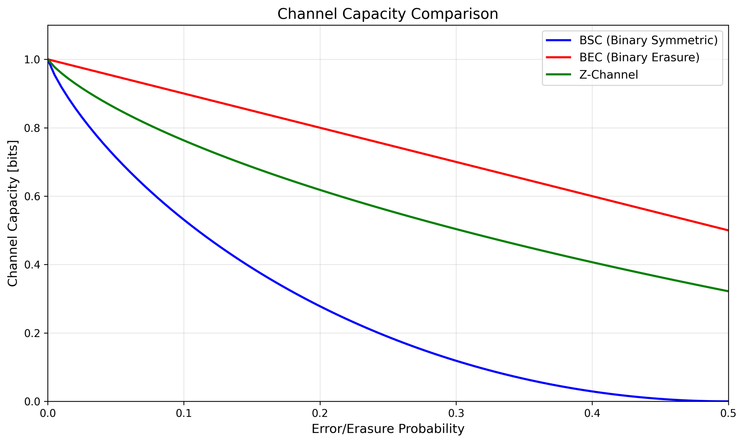说明:对比BSC(二元对称信道)、BEC(二元删除信道)、Z信道三种典型信道模型的容量特性。