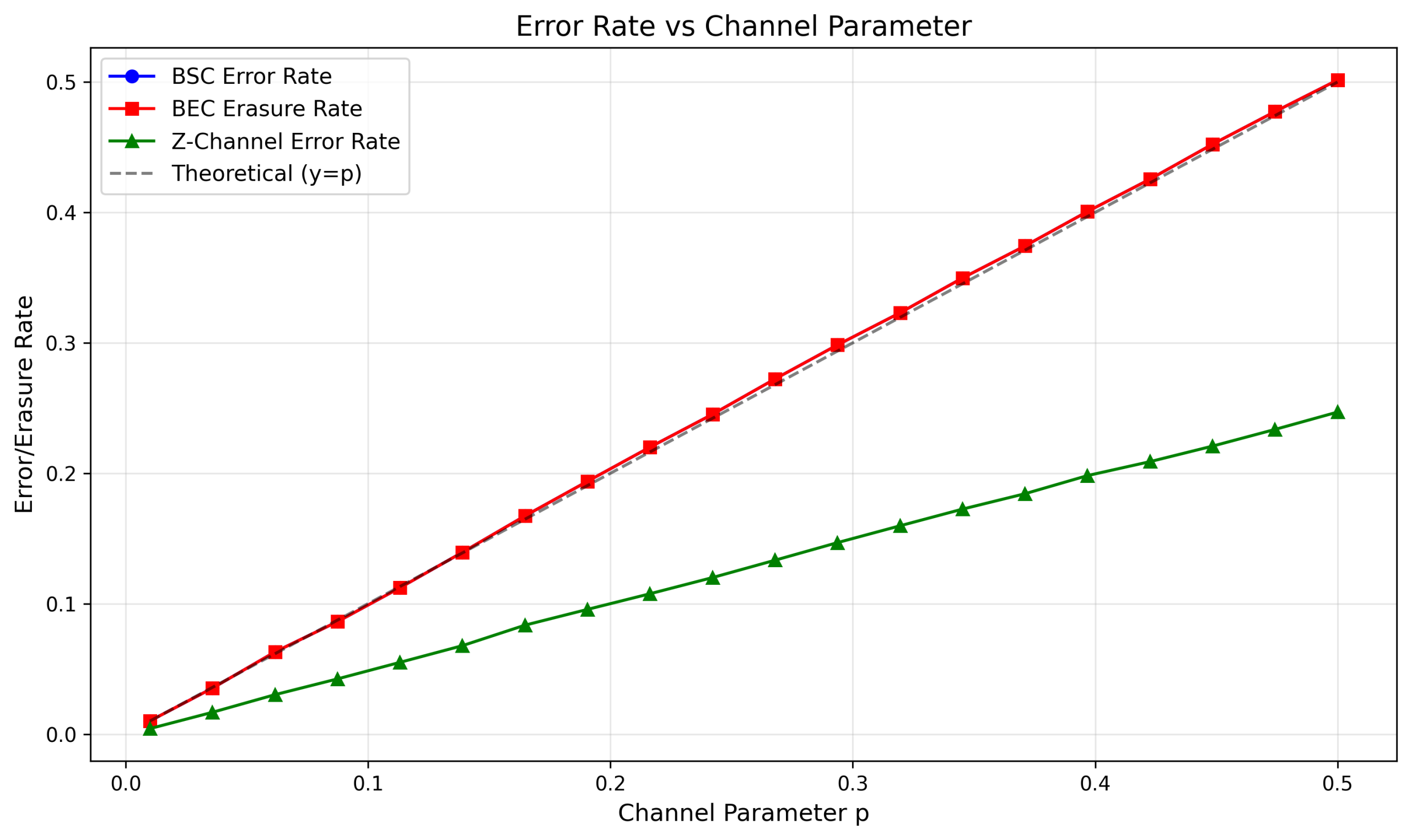 -- BSC和Z信道的误码率随p线性增长