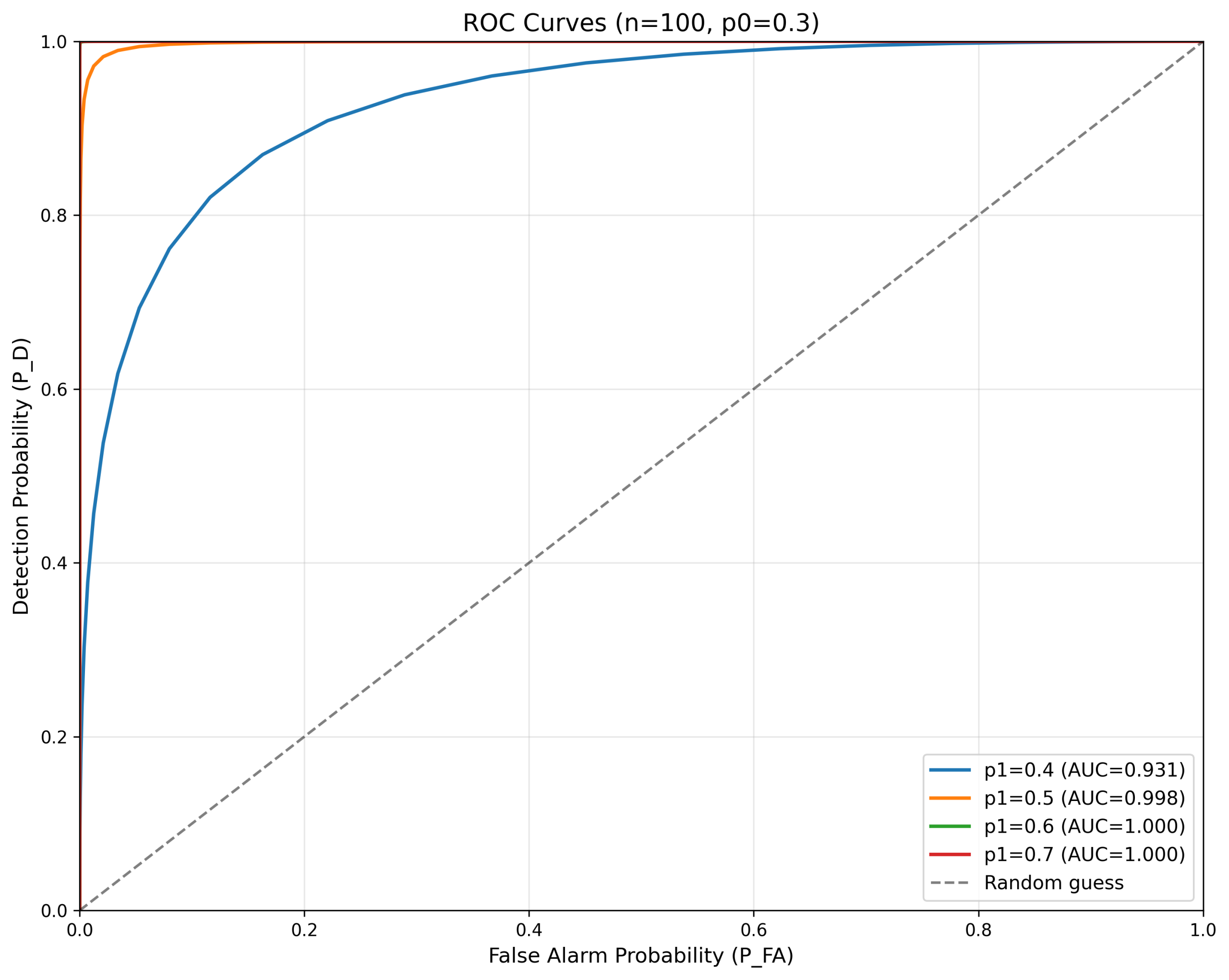-- p1=0.7时AUC接近1.0,检测性能优异