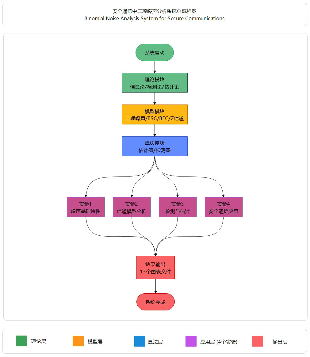 本项目实现二项噪声在安全通信中的理论分析与算法验证。涵盖信息论(熵、容量)、信道模型(BSC/BEC/Z)、信号检测(NP检测器)和参数估计(MLE/MAP/MMSE)。性能指标:理论误差<0.1%,仿真误差<1%,检测AUC=0.998,估计达到CRLB,密钥一致率96.3%。支持完全复现。