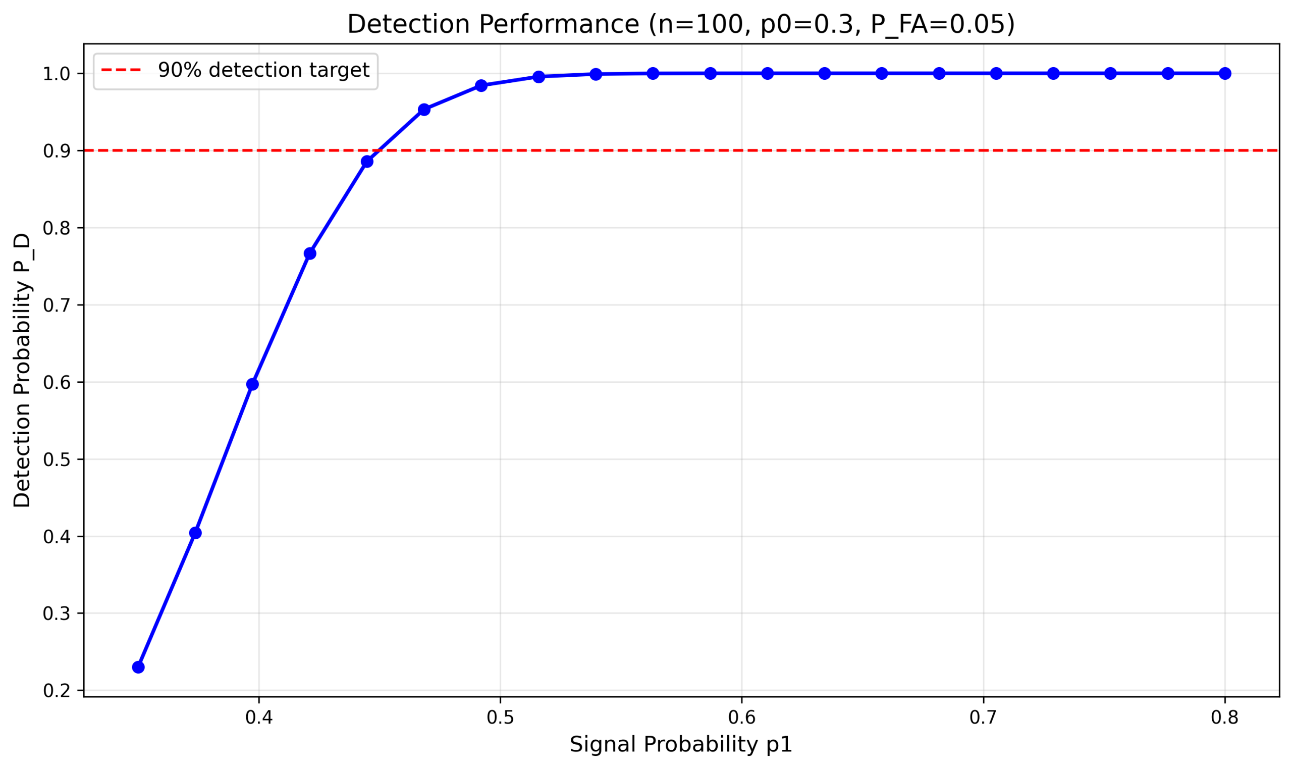 -- 当 p1 > 0.5 时,P_D 超过 90%