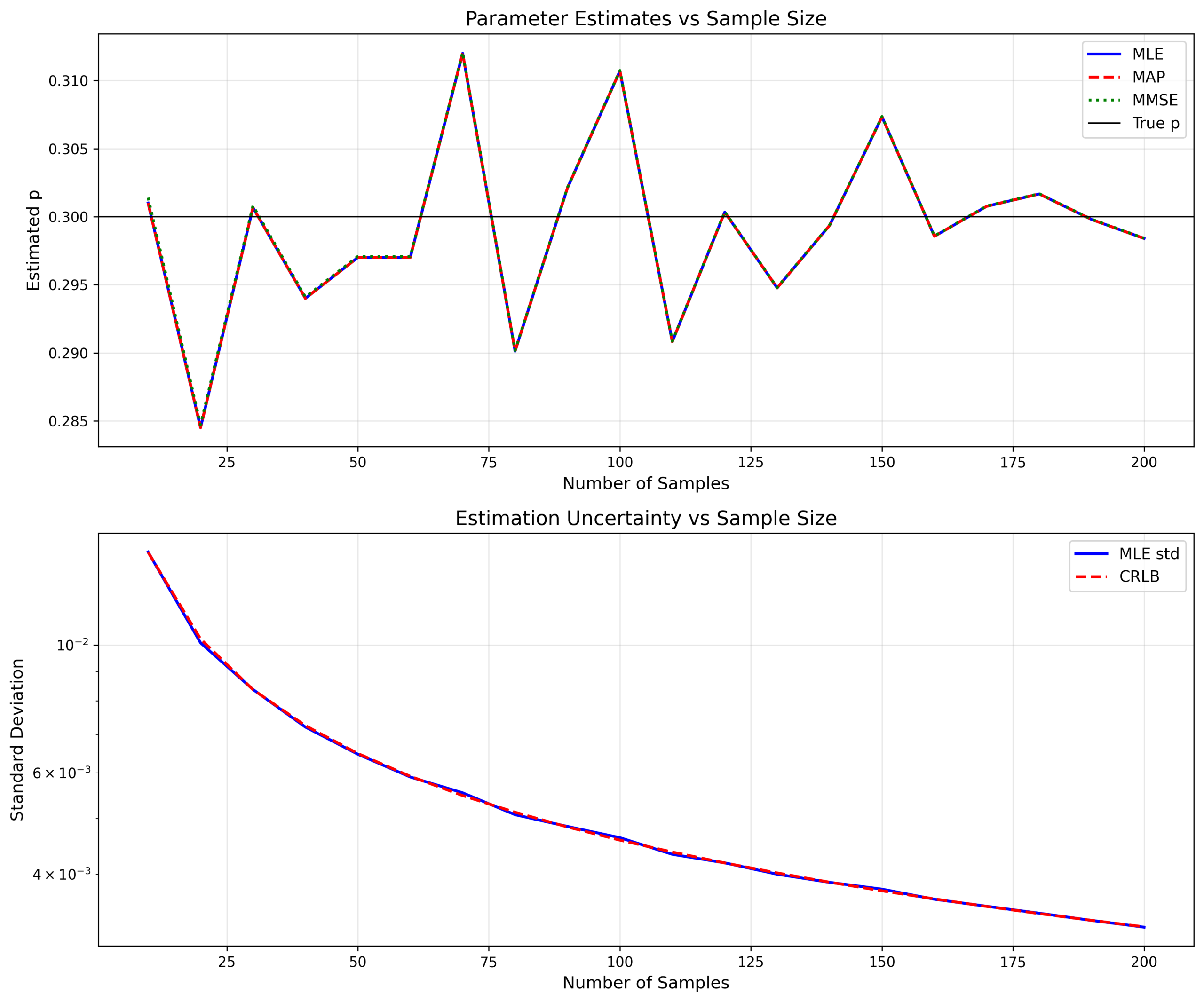说明:对比MLE(最大似然)、MAP(最大后验)、MMSE(最小均方误差)三种估计器的性能,分析样本量对估计精度的影响。