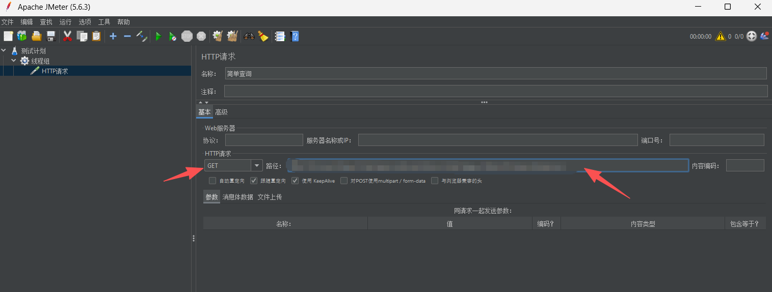 选择请求方式、输入path(url全部复制到path,可以不用填前几个)