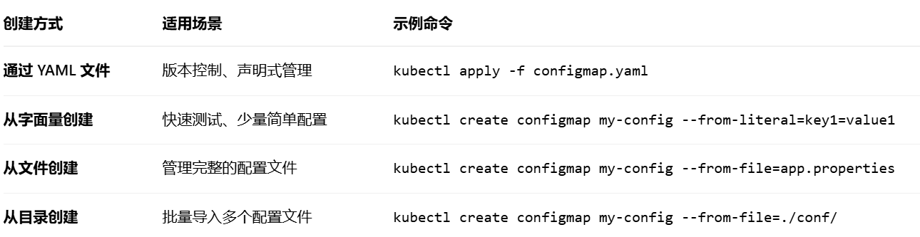 ConfigMap 支持多种创建方式,以适应不同场景: