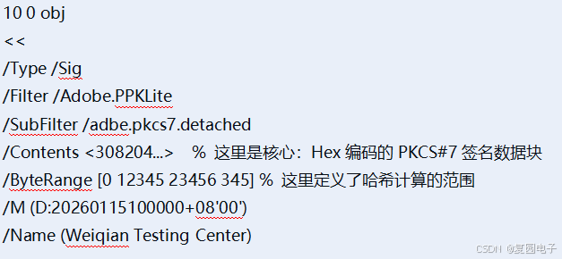 - ByteRange: 这是一个数组,告诉验签程序:"除了 Contents 尖括号里的这串数据,文件的其他所有部分都需要参与哈希计算。"