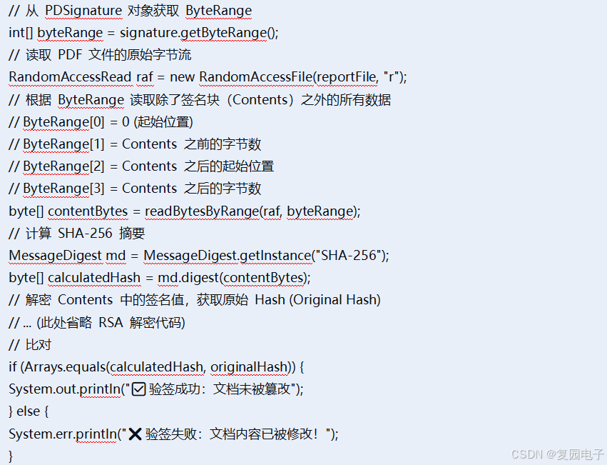 PDFBox 提供了原生的 verifySignature 接口,但为了展示原理,我们手动模拟一下核心过程: