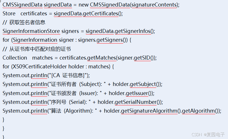 下面的代码展示了如何加载 PDF,遍历所有签名域,并解析出证书的所有者(Subject)和颁发者(Issuer)。
