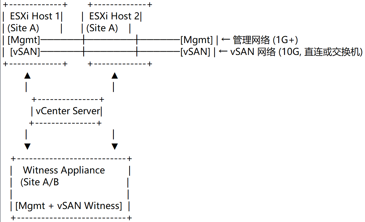 - 两台 ESXi 主机之间的 vSAN 网络应尽量直连(通过 10GbE 光纤或专用交换机),减少单点故障。