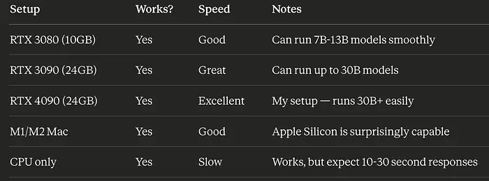 诚实的事实: 如果您有过去 3-4 年的任何游戏 GPU,您可以运行本地 AI。它可能比云慢,但它可以工作。