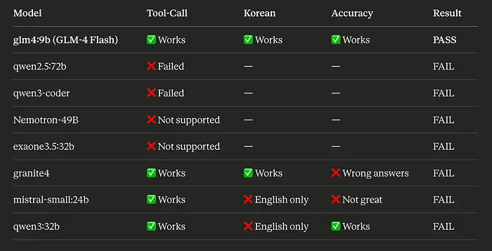 在我确定当前设置之前,我测试了超过 20 种不同的模型。我不仅是在检查它们是否能回答问题。我有三个严格的要求:工具调用 (它可以使用搜索或计算等功能吗?)、韩语语言 (当用韩语询问时它是否用韩语回复?)和准确性(答案实际上正确吗?)。