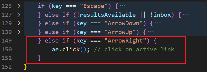 这里的 ae.click 表示触发点击事件,跳转页面,用来模拟鼠标点击当前高亮的链接,此时用户按下 → 键,就像点击了一下,非常直观,当然,这里除了 → 键,直接按 Enter 键也是可以跳转的,没问题