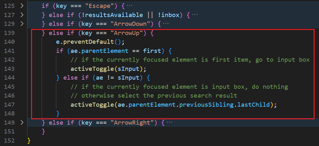 和前面的 ↓ 键有点类似,逻辑对称,首先 e.preventDefault 同样表示阻止默认滚动行为,然后如果已经在第一项的话,就回到搜索输入框,或者向上移动到上一个结果
