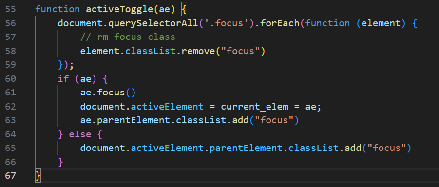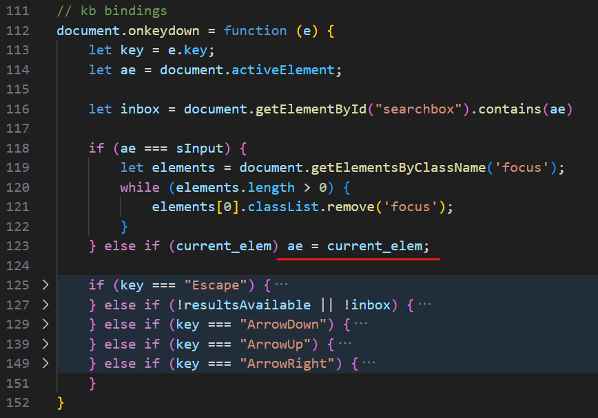 所以这里的实际效果是把 ae 赋值给全局变量 current_elem(供后续导航使用),用于记录当前选中项,但 document.activeElement = ae 完全无效,会被浏览器忽略