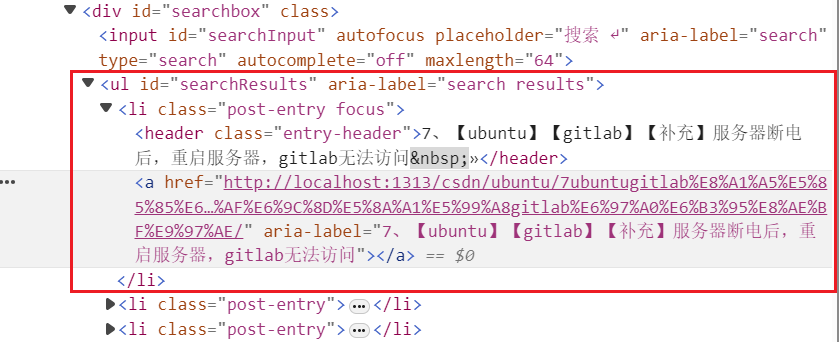 这里额外说下 resList.firstChild.lastChild,之前在 search.html 模板介绍过这个 HTML 结构如下,resList 是 <ul> 搜索结果集合,firstChild 是 <ul> 搜索结果中的第一个 <li> 列表项,而 lastChild 是 <li> 列表项里最后一个元素 <a href ...>,也就是搜索结果链接
