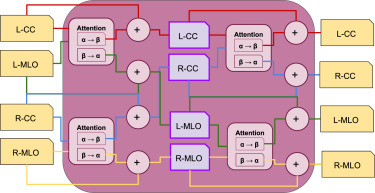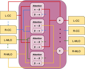 图6.侧面相关四视图交叉注意力模块方案。首先,对于每一侧(L-CC和L-MLO,R-CC和R-MLO),执行成对注意力操作,然后加到各自的视图中。然后对每种视图类型(L-CC和L-MLO,R-CC和R-MLO)应用相同的操作。