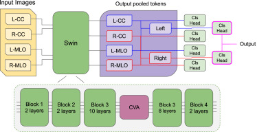 图4.本工作中使用的MaMVT架构示意图:四个视图通过共享的Swin骨干网络,在第三个块的第10层之后插入一个额外的跨注意力块,以在每个视图之间执行交叉注意力。每个视图的最终输出通过一个分类层,用于额外的损失计算。两个左右视图还被连接以获得左右表示,这些表示也通过一个分类层,并用于执行损失计算和获取检查的最终分类结果。