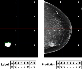 图5.补丁监督方法的简化示例:左侧显示的是图像掩码,分割成补丁并转换为下面的标签向量,其中每个值对应一个补丁:索引5和7设为1,因为它们各自的补丁包含病灶。右侧显示的是按照相同结构对每个图像补丁进行的假设预测:在此示例中,除了补丁5之外,所有补丁都正确预测。