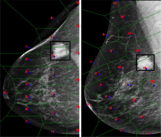 图2.同一乳房在两种投射下的伪特征点及其相应镶嵌的表示。