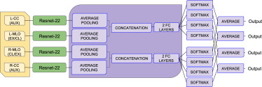 图1.Wu et al. (2020)提出的NYU模型的示意图。骨干参数在相同视图(CC和MLO)的图像之间共享,如不同颜色所示。损失根据softmax输出计算,并在推理时对CC和MLO视图的预测进行平均。