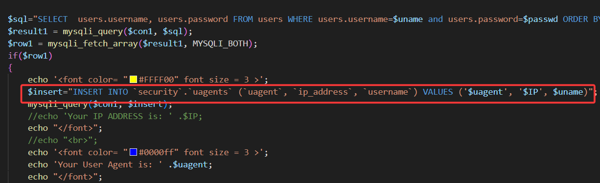 但是查看源码可以发现,当username和password校验成功后,后端会接收我们的ip和uagent,随后直接放入insert语句中执行。