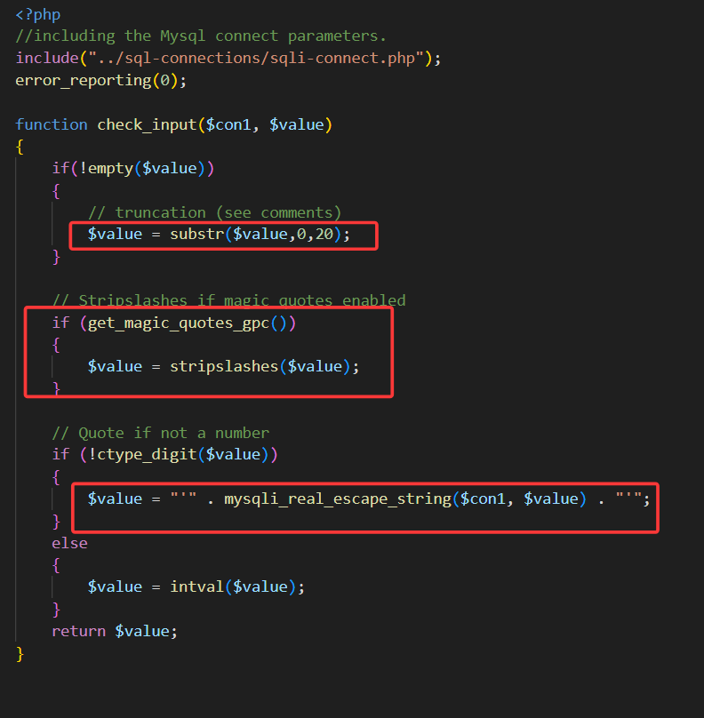 查看源码,这一关开始对我们的输入进行过滤了,限制了user字段,输入不能超过20字,且会自动给单引号加上转义斜杠,使得我们无法像之前一样,闭合查询语句。