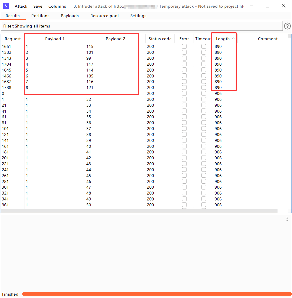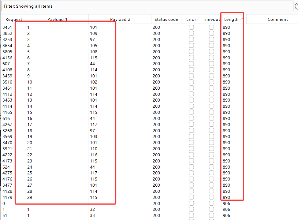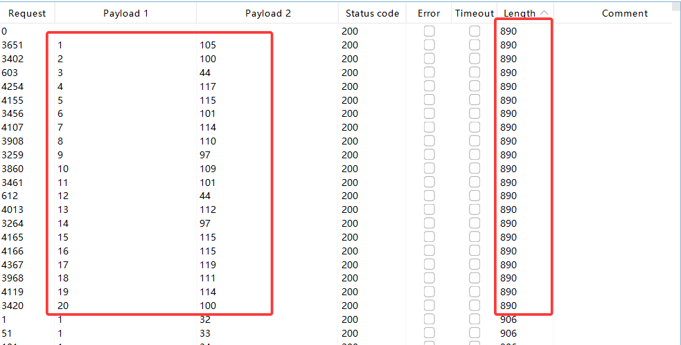attack结束后,根据Length和payload1排序可得: