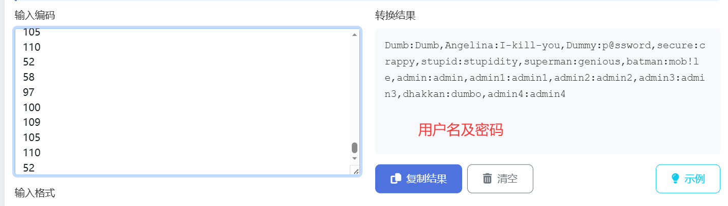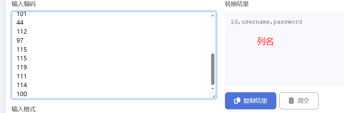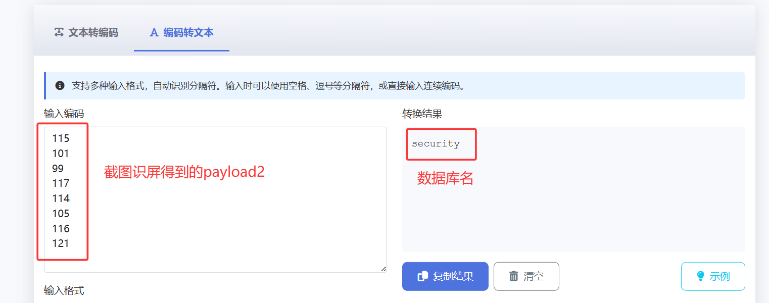 此时直接将payload2 第1-8行的值截屏识图,提取出数字(就不用手动挨个输入),放入ascii在线转换网站中,得出数据库名
