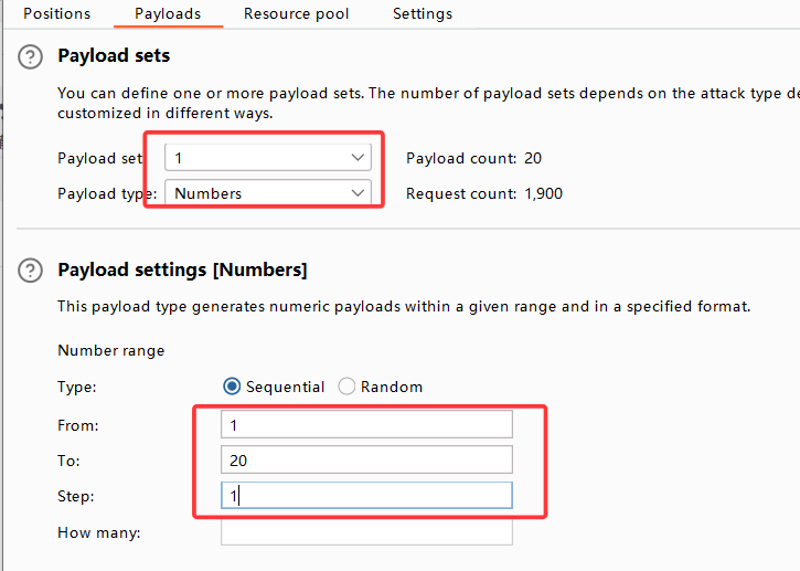 来到payload设置,第一个变量设置,我们估计数据库名称不超过20个字,所以from 1 to 20,step=1
