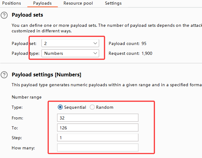 第二个变量为字符的ascii十进制值,我们查表可得,选取从32-126,step=1