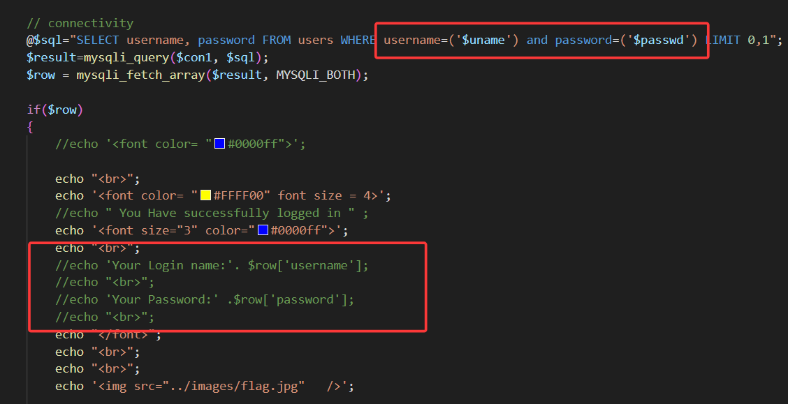 查看源码,这一关限制了user和password字段,输入不能超过20字,且会自动给单引号加上转义斜杠,使得我们无法像之前一样,闭合查询语句。