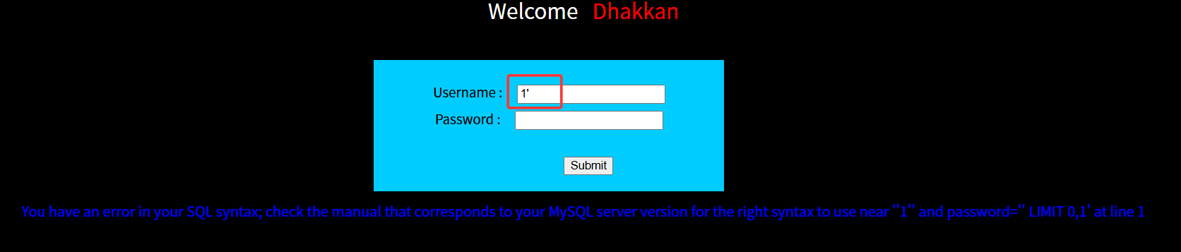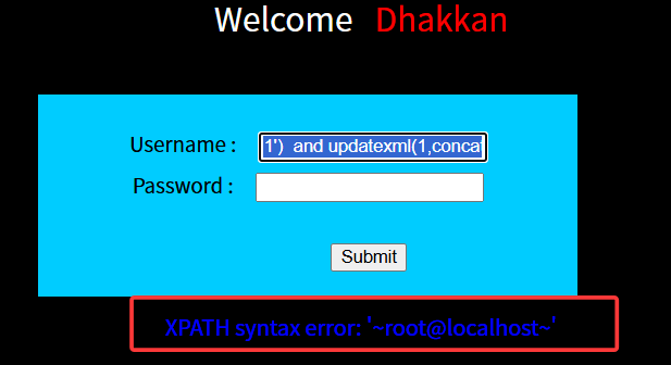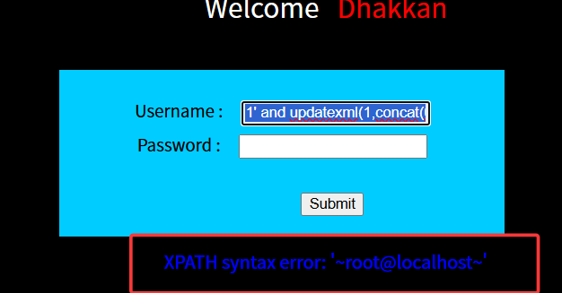 在用户名输入单引号闭合符,发现直接报错,故可以使用报错注入。